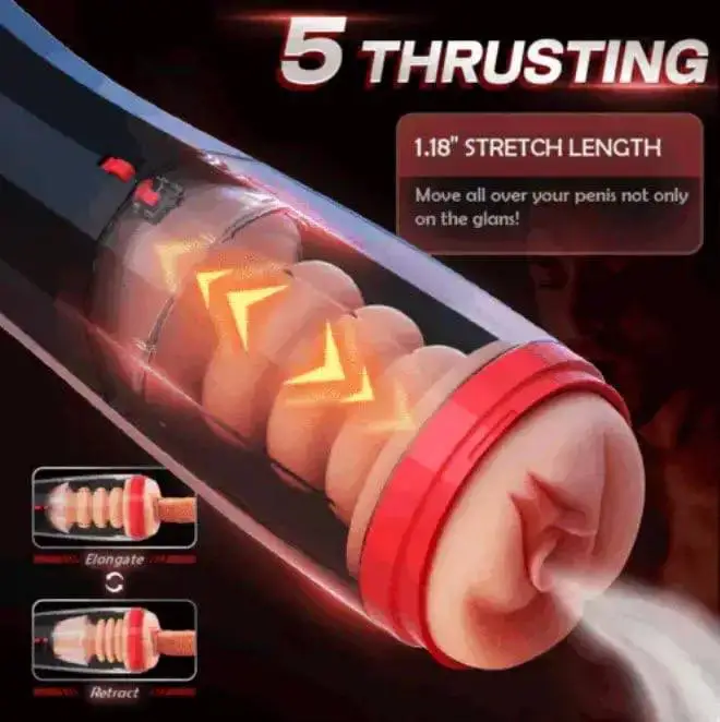Автоматичний мастурбатор з 5 швидкостями телескопічних фрикцій та 10 режимами вібрації. Гіперреалістичний TPE-рукав, вакуумне всмоктування та режим «Вибух». Живлення від акумулятора (USB). Розмір: 30х9.9 см. Знімний рукав для легкого догляду.