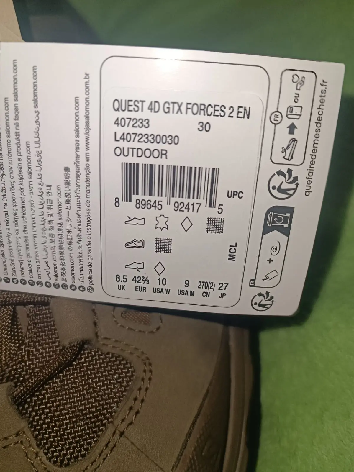Водонепроникна мембрана GORE-TEX; Підошва Contagrip® забезпечує зчеплення на мокрій, пухкій, твердій або сухій поверхні; Шасі 4D Advanced Chassis - стабільна конструкція підошви поєднує в собі два різних компоненти проміжної підошви для покращеного контролю стопи та комфорту під час активної ходи; Підошва All Terrain Contagrip® створена для найрізноманітніших поверхонь; Формована устілка OrthoLite®; Закриті гачки для тактичного використання *ці закриті гачки зменшують ризик зачеплення за шнурки; Матеріал верхньої частини: замша, яка забезпечує довше носіння та міцність; Одношарова сітка, що щільно прилягає до стопи, для максимального відчуття; Водовідштовхувальний матеріал. Спеціальна обробка застосовується для забезпечення додаткового захисту, гарантуючи, що тканина не вбирає воду під час дрібного дощу та зливи; Захищений носок