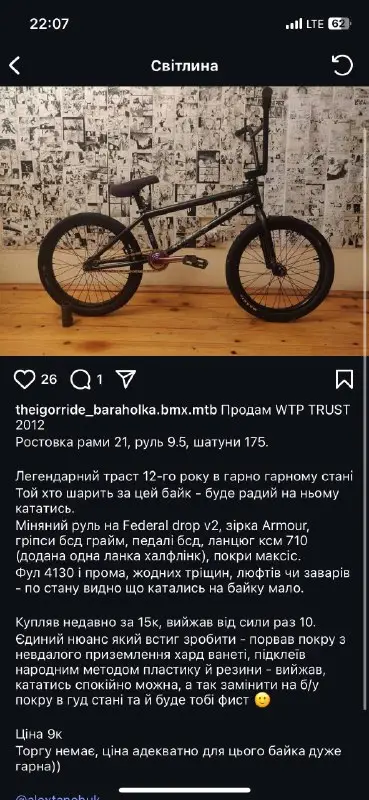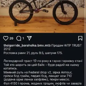 Продам BMX WTP Trust 2012 у хорошому стані. Рама 21, руль Federal drop v2, запчастини BSD, ланцюг KMC 710. Фул 4130 хромоль, промпідшипники. Без тріщин та зварювальних робіт. Є нюанс: невелика дірка в задній покришці. Деталі в приватні повідомлення.