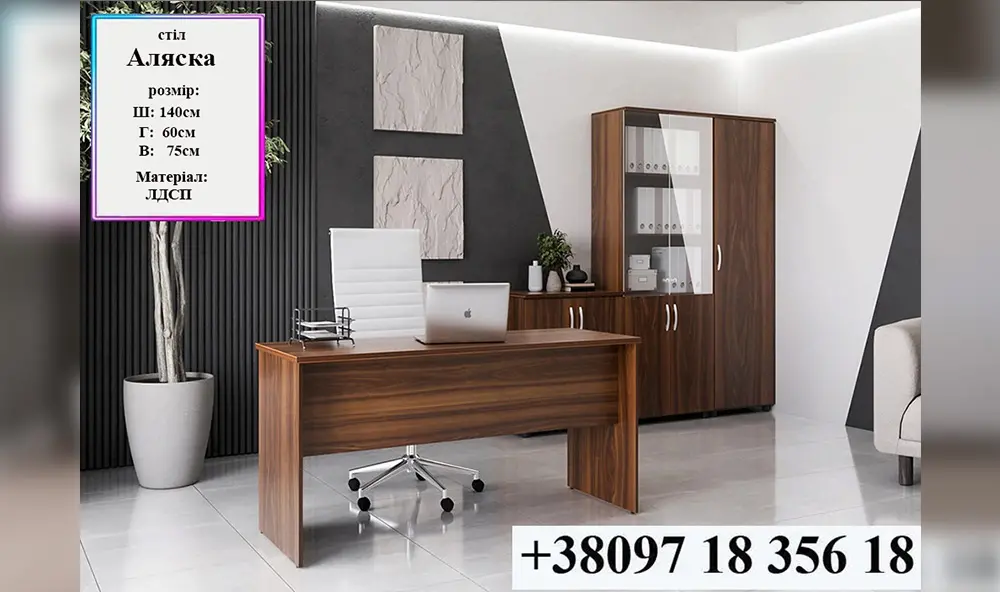 Цена указана за всю мебель на фото в цвете орех Кабинет приятный на ощупь, компактный и комфортный для работы. Конструкция прочная, изготовлена из качественных материалов. Удобно расположенные полки и выдвижные ящики позволяют организовать рабочее пространство максимально эффективно. Рекомендую данный товар для уютного и функционального офиса Кроме того, есть много вариантов решений по поводу цвета и комплектации кабинета. Например можно заказать стол, а через некоторое время другую обстановку кабинета. Изделия будут того же стиля, цвета и качества, как и предыдущая мебель. Характеристики набора мебели Аляска: Стол директора 140х60х75см Столешница и стоевые ДСП 16мм Царга ДСП 16мм Тумба мобильная 40х38х60см Крышка тумбы ДСП 16мм, Корпус ДСП 16мм Тумба стационарная 70х38х85см Крышка тумбы ДСП 16мм, Корпус ДСП 16мм Шкаф для документов стекло 70х38х190см Фасад ДСП 16мм, Корпус ДСП 16мм Пенал для одежды 50х38х190см Фасад ДСП 16мм, Корпус ДСП 16мм Набор можно заказать в комплекте, или его отдельные части по отдельности. На Ваш выбор можно изготовить мебель в любом размере, а также в 13 цветах ДСП. Срок изготовления до 10 рабочих дней. Доставка по Киеву и области производится отделом доставки нашей фабрики, а по всей Украине силами почтового оператора Новая Пошта.