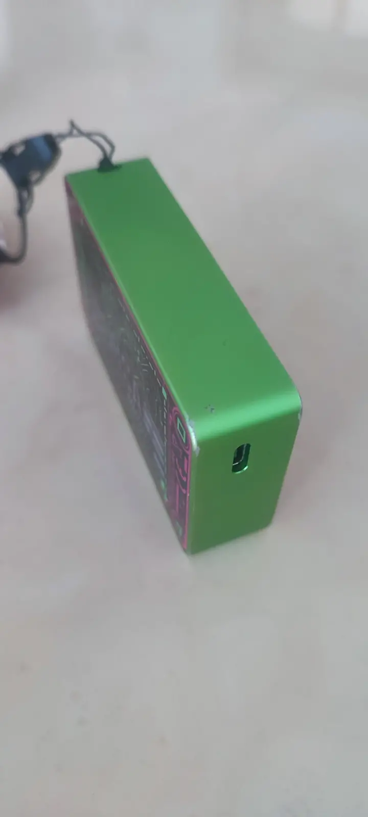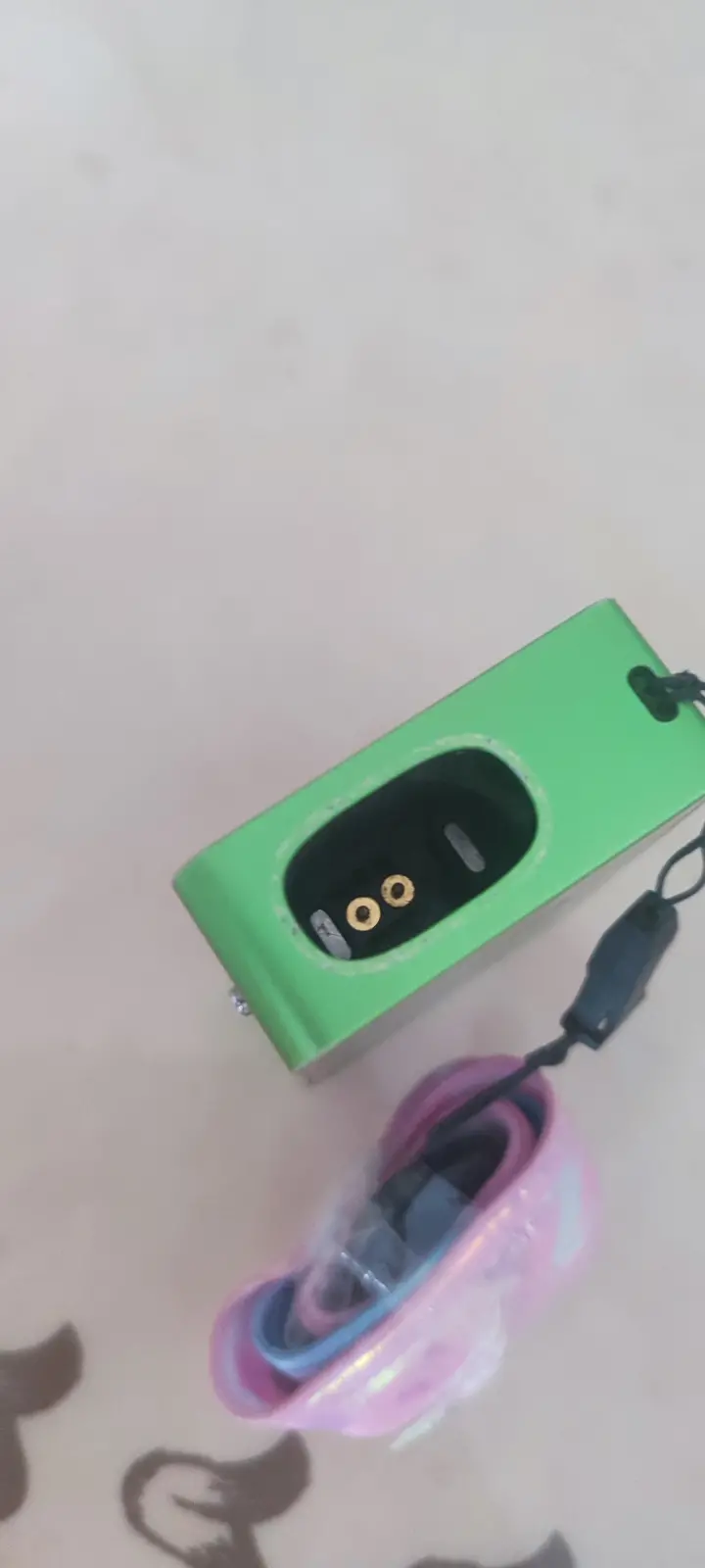 В гарному яскраво зеленому кольорі (cyber elf). Загальний стан близький до ідеального. В комплекті лише його рідний шнурок на шию, можу покласти не оригінальний кабель для зарядки та картридж на 0.8 Ома для перевірки працездатності, але його краще буде замінити на новий. Сам вейп в дуже гарному стані, є лише дві невеликих потертості (видно на фото) Хто не знає, то фішкою цього вейпа є дві міні гри, одна шось на кшталт слотів, інша як тамагочі. Дуже оригінальний дизайн у вигляді джойстика до ігрової приставки 90х років.