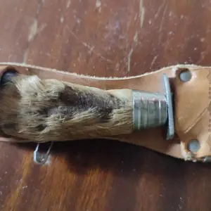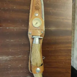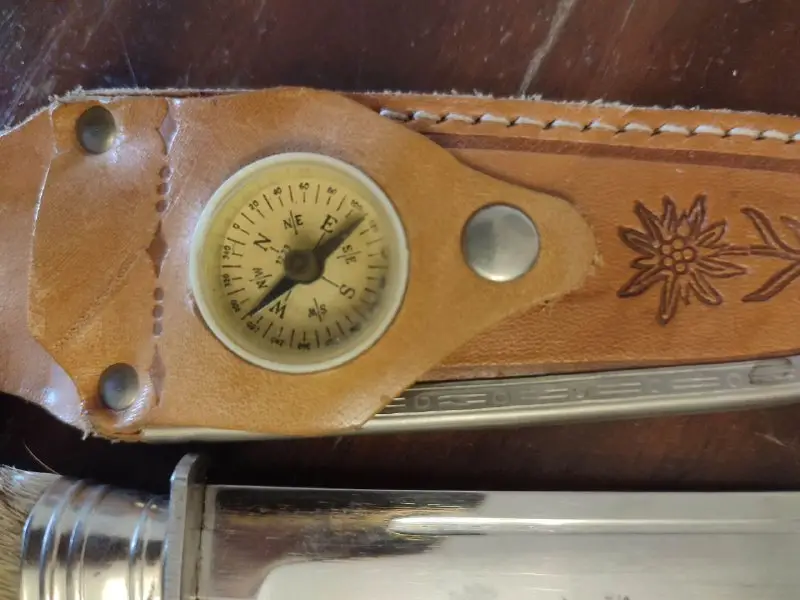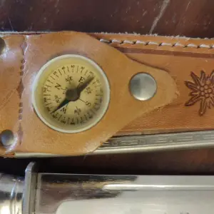 Винтажный нож производства ГДР 80-х годов с рукояткой 'козья ножка' и встроенным компасом. В комплекте идет кожаный чехол. Нож имеет следы времени и потертую рукоятку. Находится в Киеве.
