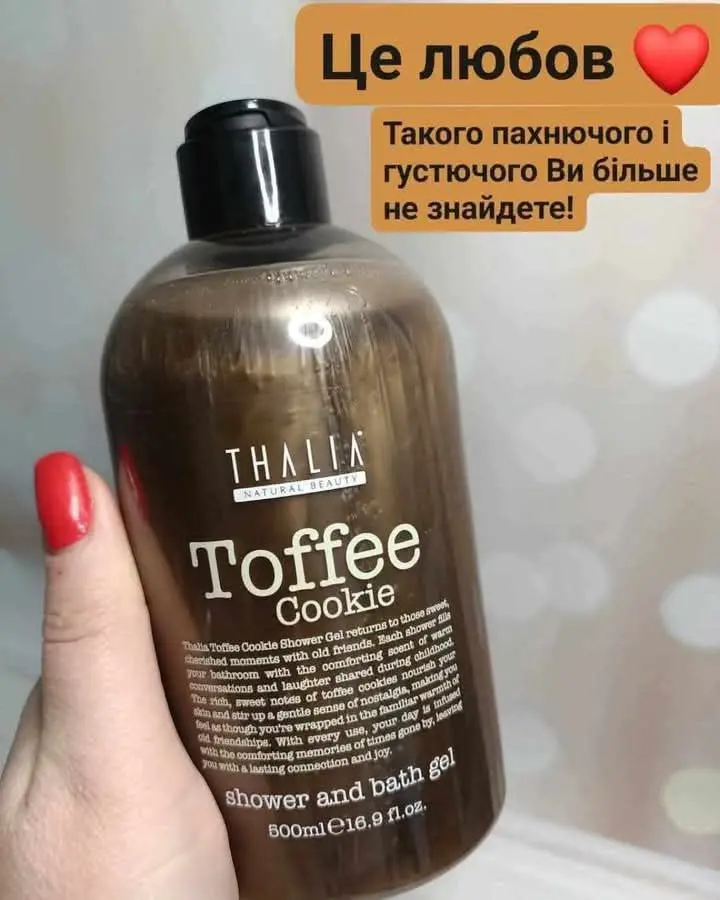 ПАРФУМОВАНІ ГЕЛІ ДЛЯ ДУШУ THALIA, 500мл З НИМИ ВАННА КІМНАТА ПЕРЕВТІЛЮЄТЬСЯ У СПРАВЖНІСІНЬКИЙ SPA - салон 👑Яскраві аромати легким шлейфом огортають тіло, даруючи шкірі ніжність оксамиту.... 💞ЗАДОВОЛЕННЯ.... 💞ЗНЯТТЯ НАПРУГИ.... 💞ПРИЛИВ ЕНЕРГІЇ.... АСОРТИМЕНТ: 💜Ягоди Асаї — заряд бадьорості та енергії! 💚Фрукти Ноні — екзотика, що огортає ніжністю. 🤎Печиво Тоффі — солодкий аромат справжнього комфорту. 🩵Морська сіль — свіжість океану у кожній краплі. 🩷Ванільні фантазії — вишуканість, яка дарує спокій. 🏆Натуральні інгредієнти. 🏆Густі та економні.
