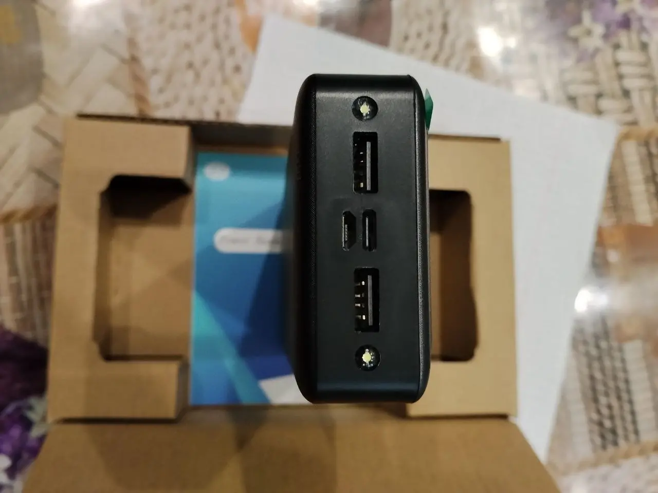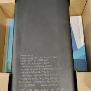 Продається новий портативний акумулятор (Power Bank) Delicate ємністю 20000 mAh з дисплеєм та двома ліхтариками. Модель: KP11. Акумулятор має електронне табло для відображення рівня заряду в процентах (25, 50, 75, 100). Має 4 виходи для одночасної зарядки декількох пристроїв. Ємність акумулятора: 20000mAh (74Wh). Номінальна ємність: 11200mAh. Вхід: 5V/2A. Вихід: 5V/2A. Модель: K211. На корпусі розташовано логотип виробника – EXJ. На задній панелі нанесено інформацію про технічні характеристики та виробника (Huizhou Gaoxin Electronic Science & Technology Co., Ltd.). Також є позначки відповідності стандартам FC, RoHS, CE. На одному з торців розташовані: кнопка вмикання/вимикання, чотири USB порти (два великі і два маленькі) та два вбудовані ліхтарики, розміщені з боків портів. Стан: новий, в оригінальній упаковці. Ціна: 1000 грн.