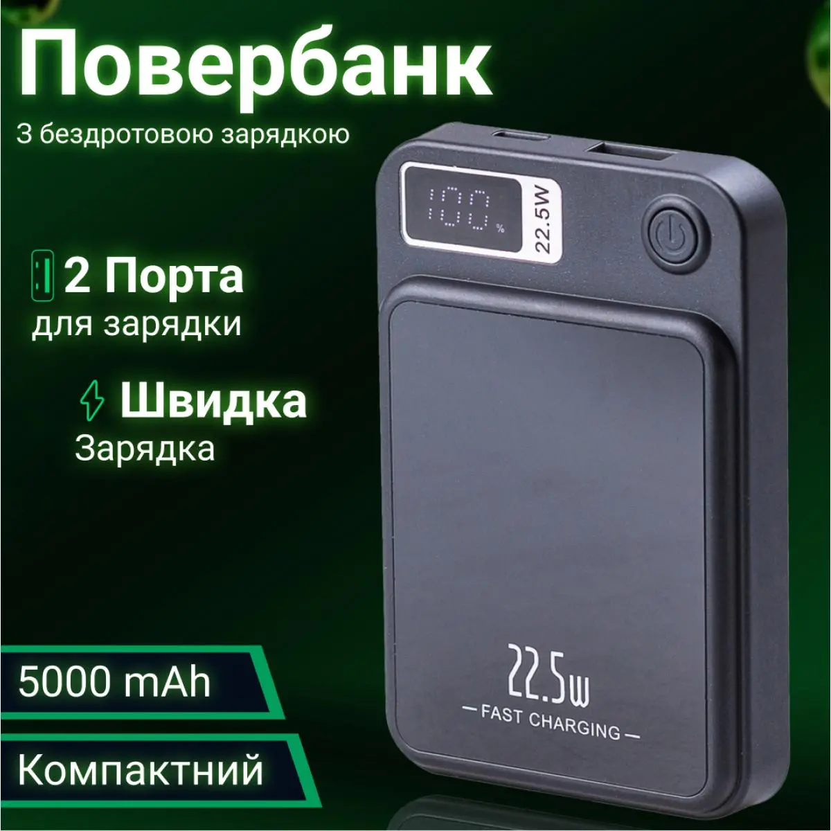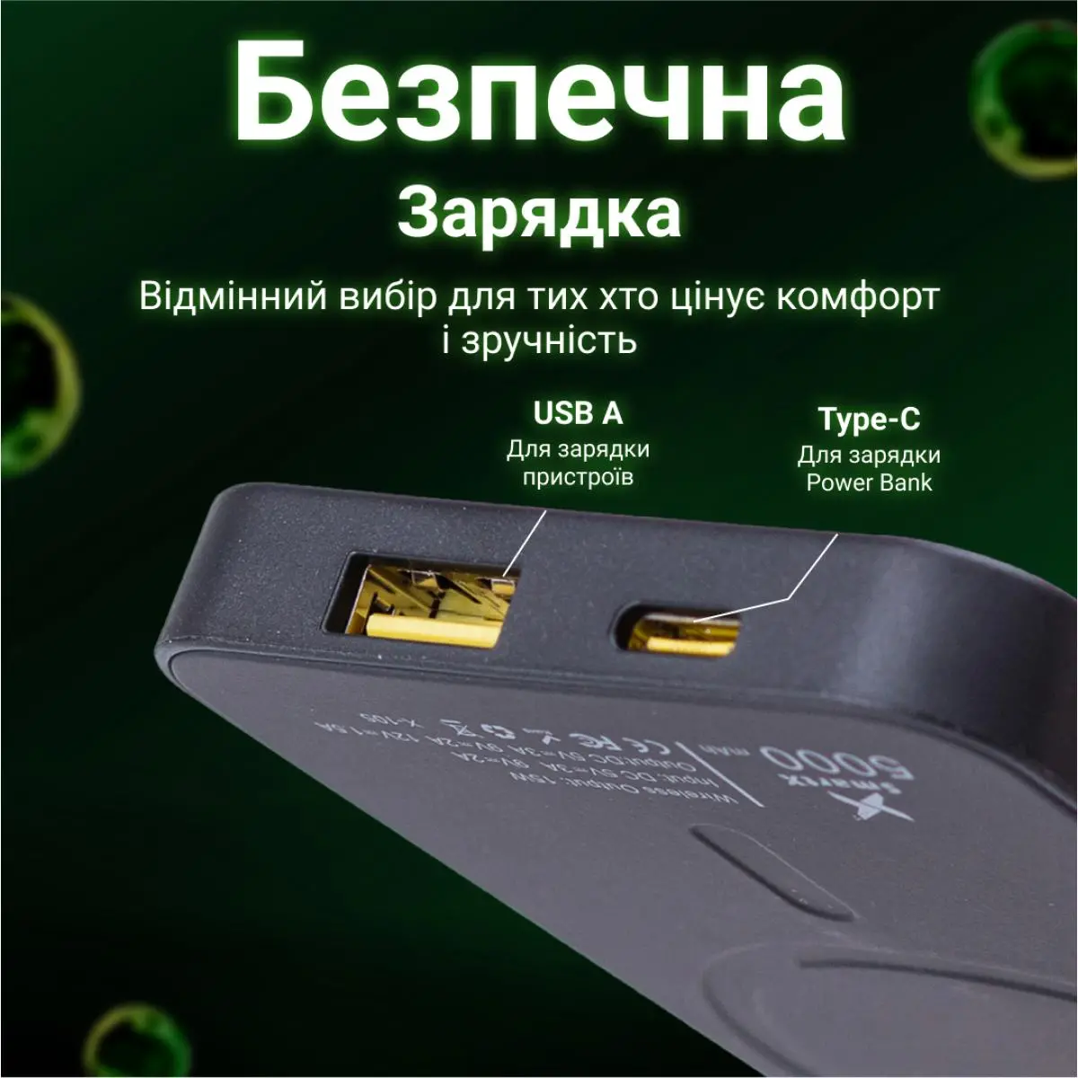 Повербанк 5000 mah з бездротовою зарядкою usb-c/usb-a, чорний