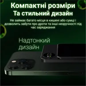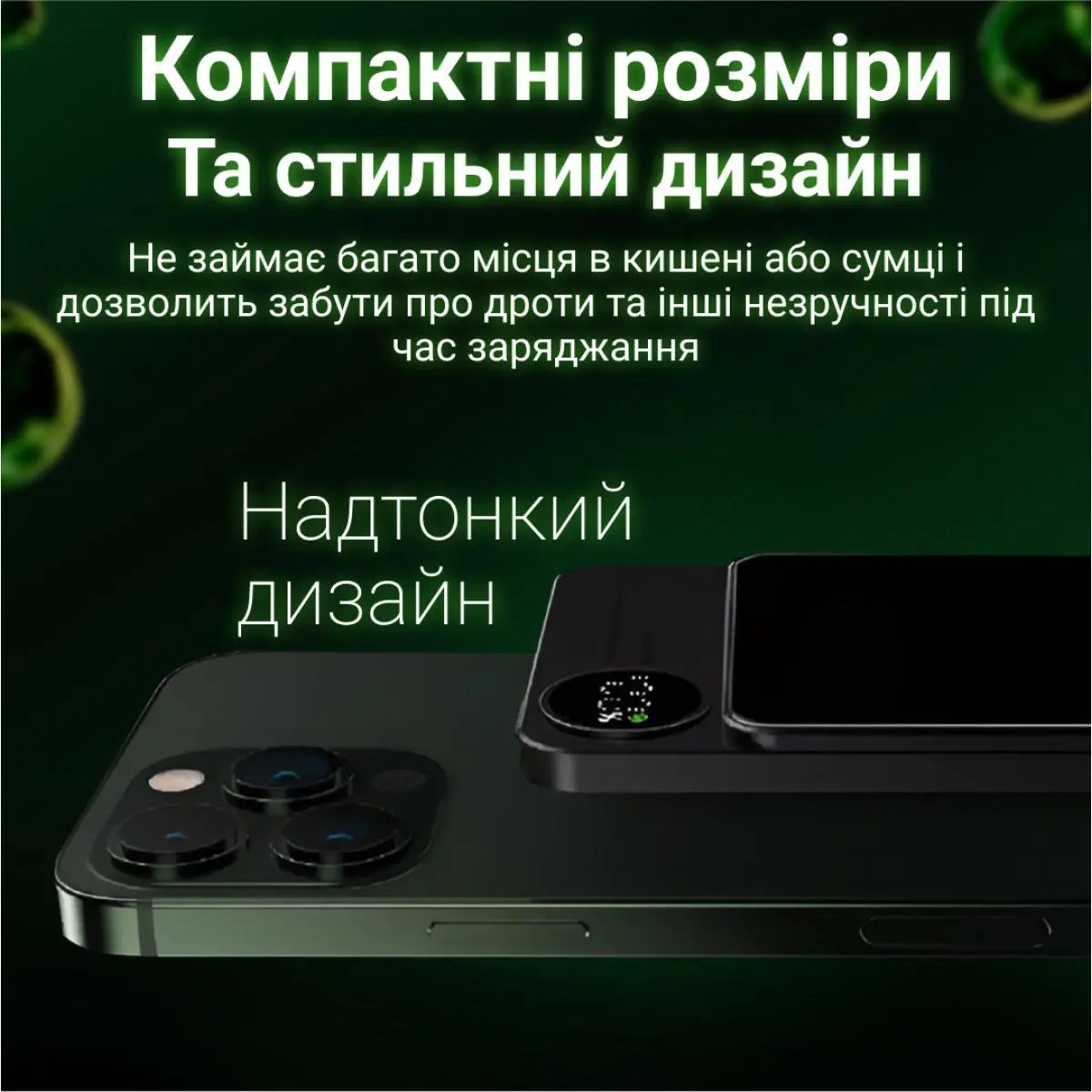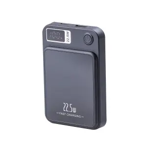Повербанк Smart X ємністю 5000 mAh з бездротовою зарядкою — Зовнішній акумулятор оснащений MagSafe магнітами, що дозволяє заряджати гаджети, що підтримують цю технологію. Характеристики: Тип акумулятора: Li-Pol Місткість: 5000 mAh Швидка зарядка: 22,5 Вт Магнітна зарядка: 15 Вт Роз'єми: USB-C, USB-A Матеріал оболонки: Пластик Габаритні розміри: 9,561,5 см Особливості: Цифровий дисплей Захист від перепадів температури Захист від перепадів напруги Захист від глибокого розряду