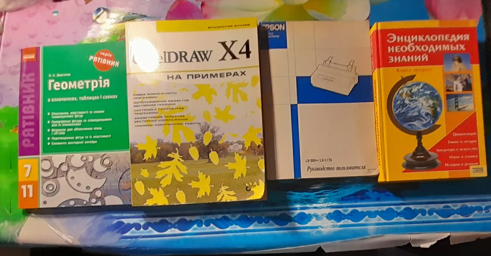 📚 4 книжки комплектом або окремо, ціна за комплект вказана в оголошенні, комплектом буде дешевше, а ціна на окремі книжки різна: 📌 Геометрія, стан ідеальний 💵 Ціна - 70 грн 📌Самовчитель по CorelDrawX4, є дефекти у вигляді заплаток на сторінках. 💵 Ціна - 140 грн. 📌 Самовчитель по принтеру Epson2001, стан ідеальний 💵 Ціна - 140 грн. 📌Книга ерудита або енциклопедія знань, стан ідеальний 💵Ціна - 300 грн. 📬 Доставка Укрпоштою або Новою Поштою.
