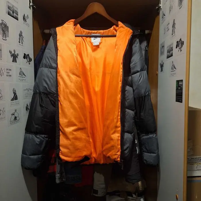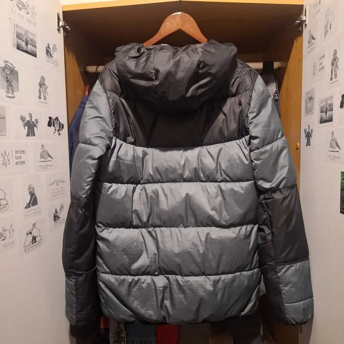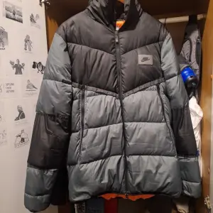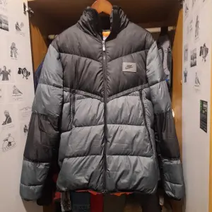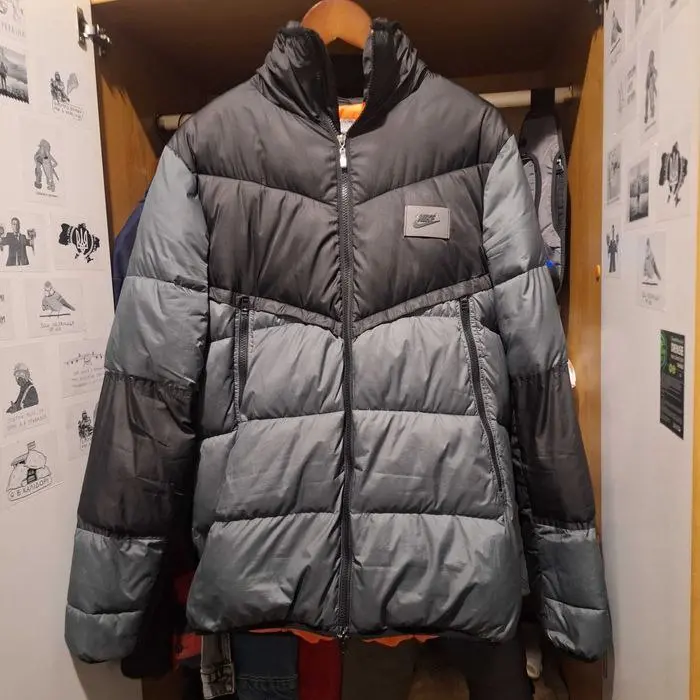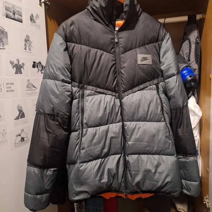 Пуховик Nike в размере L. Состояние ткани отличное, но требуется ремонт: нужно перешить змейку (сейчас застегивается только до шеи). Стильная и теплая модель.