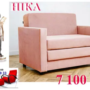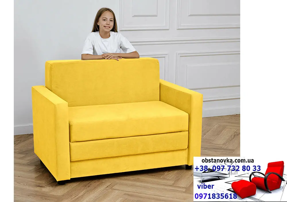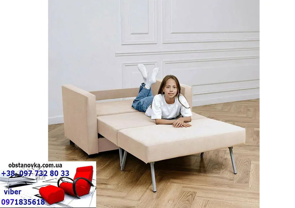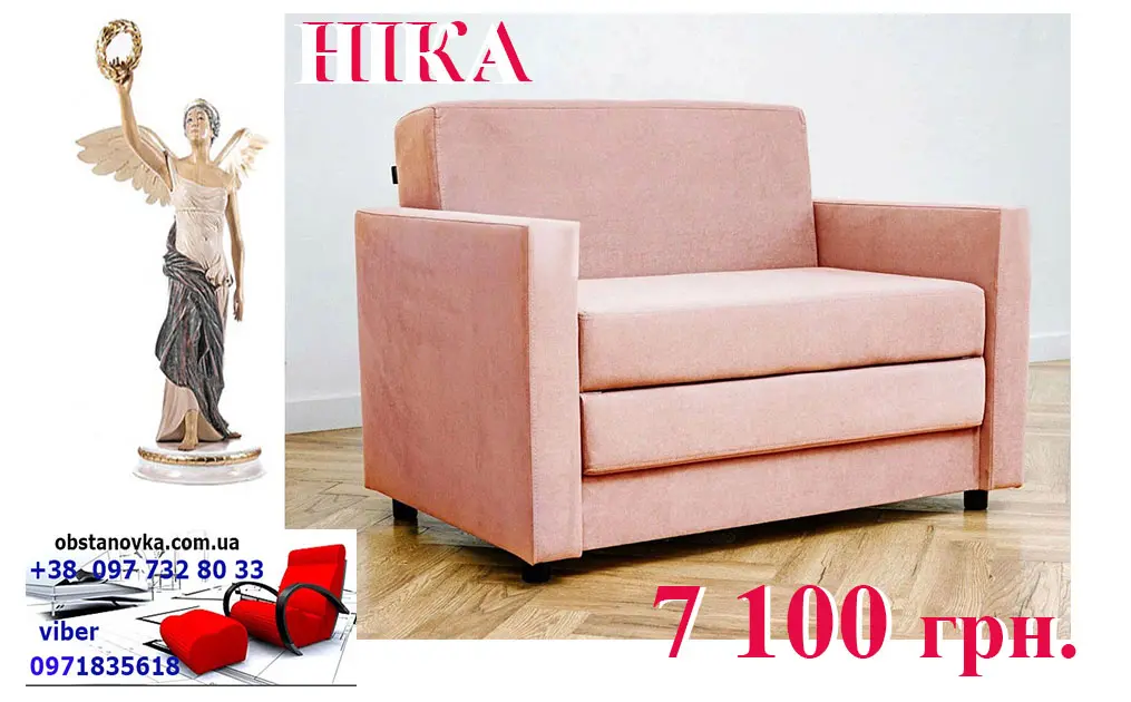 Модель розкладного дивану крісла Ніка на сьогодні найпопулярніша модель для повсягденного сну, не тільки через доступність ціни, а й через свою надійність і зручність. Диван ідеально як "гостовий варіант", у дитячу, на кухню, балкон. Глибина диван у складеному вигляді всього 80 см, що дозволяє ставити у невиликі приміщення і мати повноцінне спальне місце. Модель дивану має компактну форму, привабливий зовнішній вигляд і ортопедичний матрац. Диван не великий за габаритами і має розмір повноцінного спального місця завдяки своїй конструкції. Диван не важкий, стійкий і зручний для повсякденного сну. Розміри у складеному вигляді при ширині спального місця 80 см: Ціна 7 100 грн. Довжина 102 см глибина 80 см та висота 84 см. Величина спального місця: ширина 80 см і довжина 190 см. Розміри у складеному вигляді при ширині спального місця 90 см: Ціна 7 300 грн. Довжина 110 см глибина 80 см та висота 84 см. Величина спального місця: ширина 90 см і довжина 190 см. Розміри у складеному вигляді при ширині спального місця 100 см: Ціна 7 510 грн. Довжина 120 см глибина 80 см та висота 84 см. Величина спального місця: ширина 100 см і довжина 190 см. Розміри у складеному вигляді при ширині спального місця 110 см: Довжина 130 см глибина 80 см та висота 84 см. Величина спального місця: ширина 110 см і довжина 190 см. Ширина підлокітника 10 см. Ціна 7 710 грн. Диван має нішу для білизни. Узголів'я дивану має невелики нахил (підйом) при розкладнні у спальне місце. Дякуючи цьому нахилу хребет приймає правильно положення під час сну, зручно спати і не падає подушка. Диван має матрац середньої жорсткості на основі багатошарового ортопедичного ППУ. Наповнення матрацу дивану екологічно чисте і не алергійний матеріал - пінополіуретан (ППУ). ППУ не накопичує у себі пил, не вбирає вологу і неприємні запахи. Для каркасу дивану використовують дерево хвойних порід - посилений брус 45 мм на 60 мм "золотий стандарт". Модель дивану підходить для повсякденного сну і дорослим і дітям.