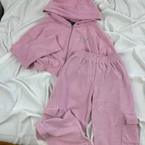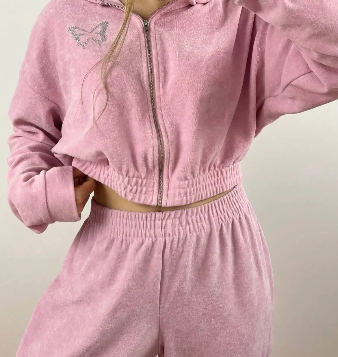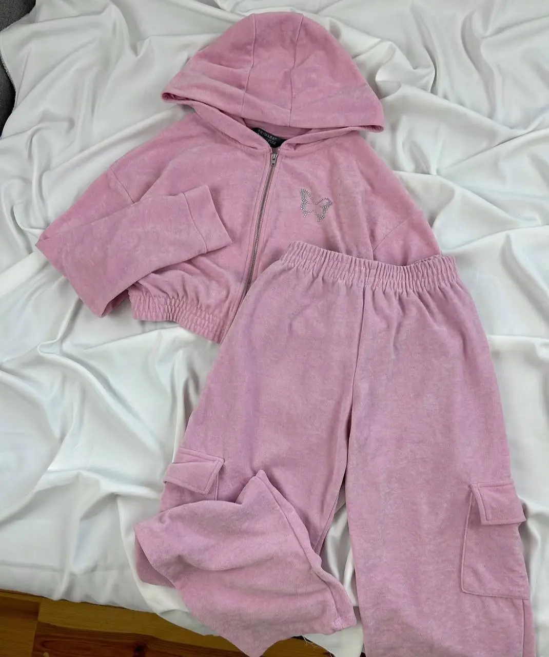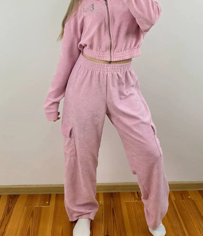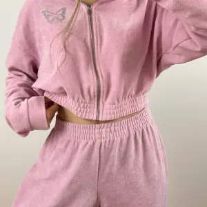 Комплект: укороченная кофта на молнии с капюшоном и брюки с карманами. Материал: мягкий и приятный к телу трикотаж (визуально напоминает велюр/махру). Кофта: короткая длина до талии, капюшон, длинные рукава, застёжка-молния, декор в виде маленькой бабочки на груди. Штаны: высокая посадка, широкий эластичный пояс, свободный крой, карманы по бокам, манжеты снизу отсутствуют. Цвет: нежно-розовый. Размер: M.