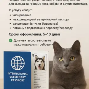 Предоставляем услуги по подготовке документов для выезда за границу кота, собаки и других питомцев. В услугу входит: чипирование международный ветеринарный паспорт вакцинация (в т.ч. от бешенства) помощь в подготовке к перелёту/переезду Сроки оформления: 5-7 дней Документы соответствуют международным требованиям Все готовые документы отправляем Новой почтой. обращайтесь в любое время в телеграмм dokumet_ua или viber WhatsApp signal
