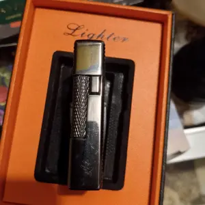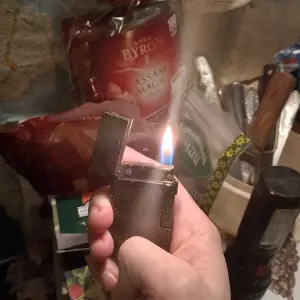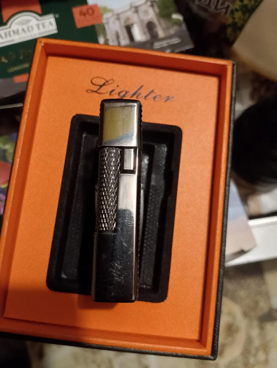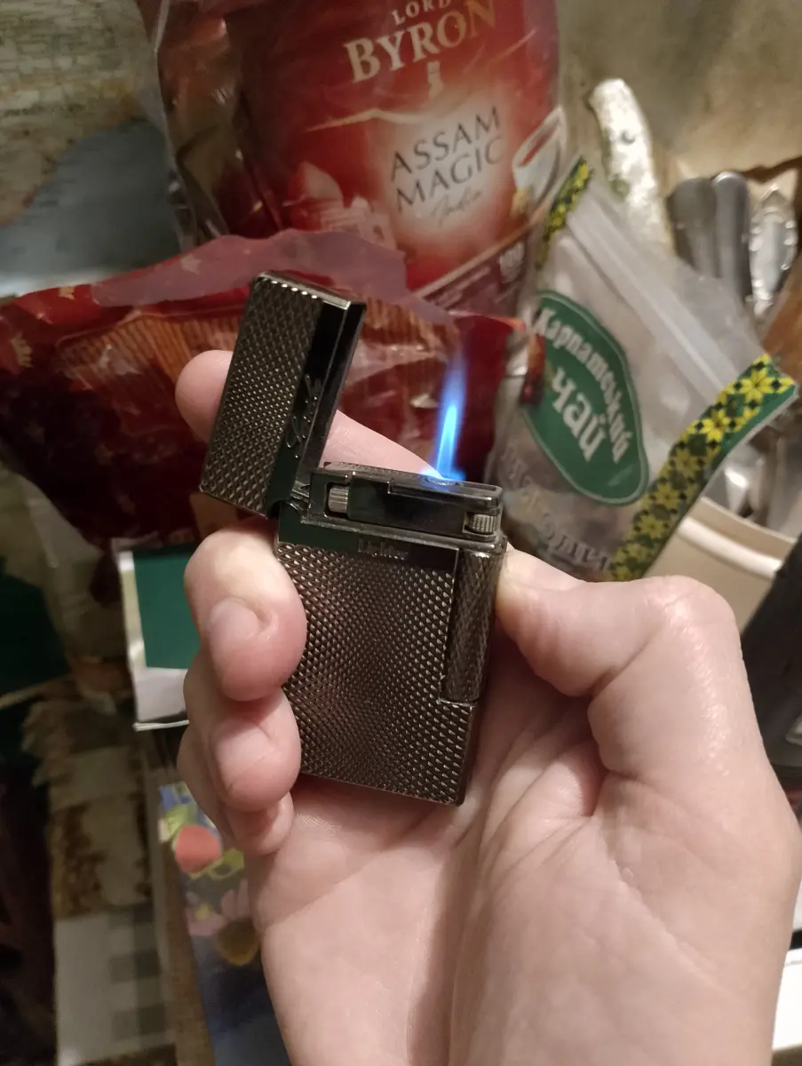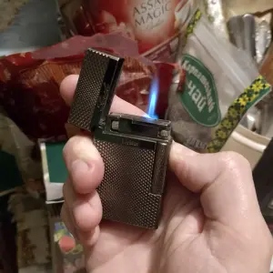 Зажигалка китайская реплика, французких зажигалок Dupont. Имеет два режима пламени, обычный от бокового барашка, и режим турбо пламени от боковой кнопки, турбо режим осуществляется с помощью наклона зажигалки и обычного пламени в бок турбо сопла. Зажигалка имеет кремень такой как в зиппо, его можно менять, дополнительные кремни идут в комплекте, они универсальны. Зажигалка может держать пламя самостоятельно без дополнительных нажатий, подобно бензиновым зажигалкам. Зажигалка в состоянии новой, покупал себе но почти не использовал так как бросил курить, за исключением не видных глазу микроцарапин на глянцевом лакированном корпусе. Цвет темный тонированный глянец, с удобной рефленной текстурой, для лучшего захвата в руке. Газ подается сразу при открытии крышки, стоит лишь крутнуть боковой барашек и будет идти пламя. Так же ее надо закрывать после использования, чтоб не выходил газ. В целом интересная зажигалка которая может работать как бензиновая только на более дешевом газе, и при этом не высыхает,не теряет запас топлива при длительном простое